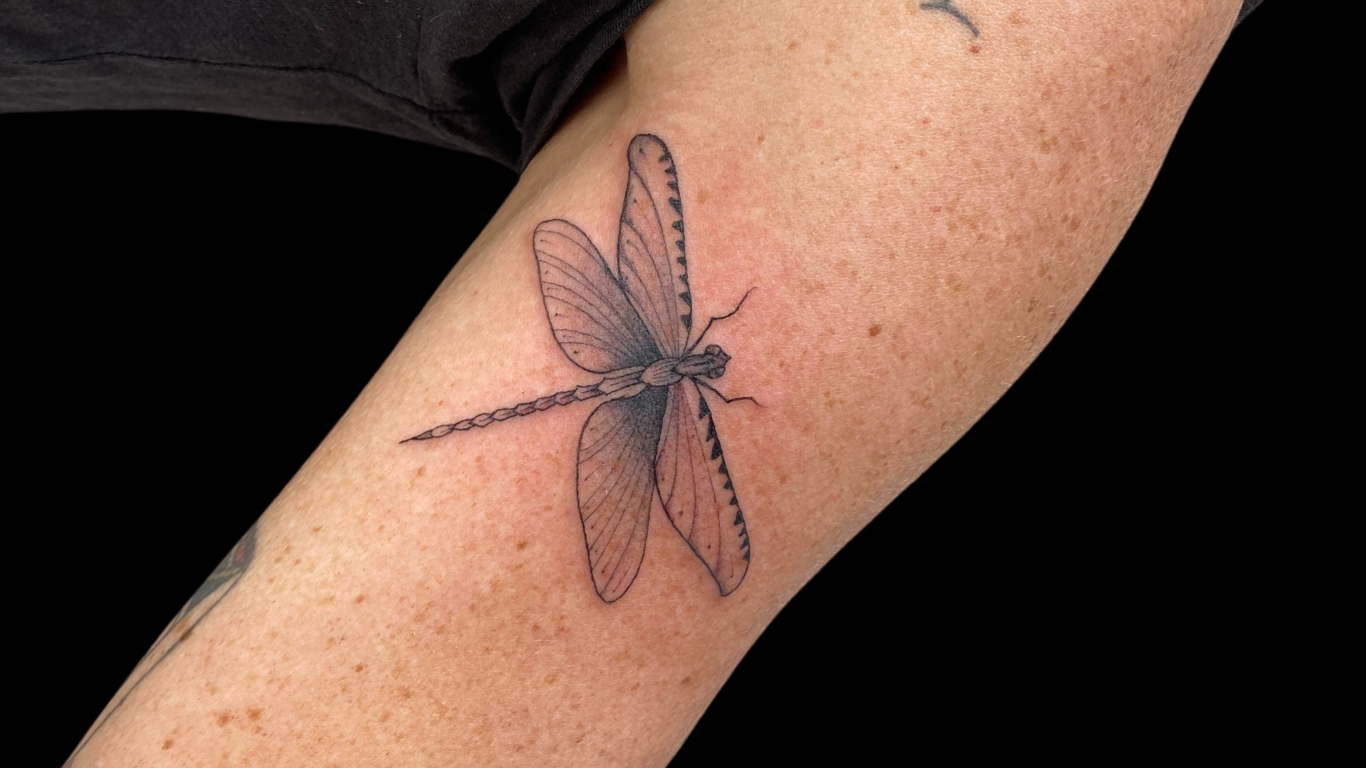 Fine line dragonfly tattoo by Luis Hinestroza.