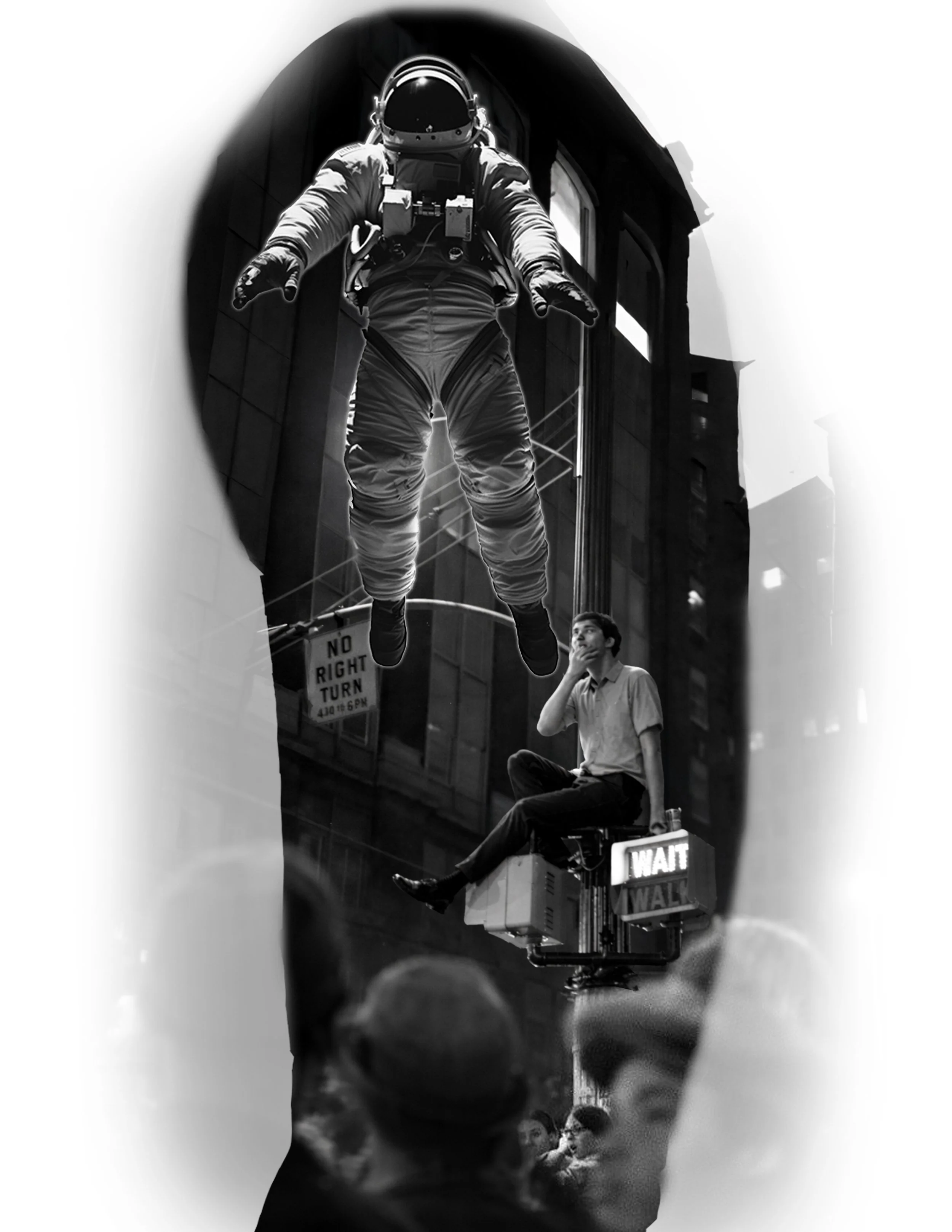 Perhaps the most symbolic image in the series, a man sits casually on a crosswalk signal box beneath a glowing sign while the astronaut hovers above him. This composition feels contemplative. The seated man appears thoughtful and almost aware of the astronaut. The signage also adds a metaphor - pause or move forward? Act or hesitate? Meanwhile, the astronaut remains suspended, untouched by the burden of decision. It’s a powerful statement for a sleeve.