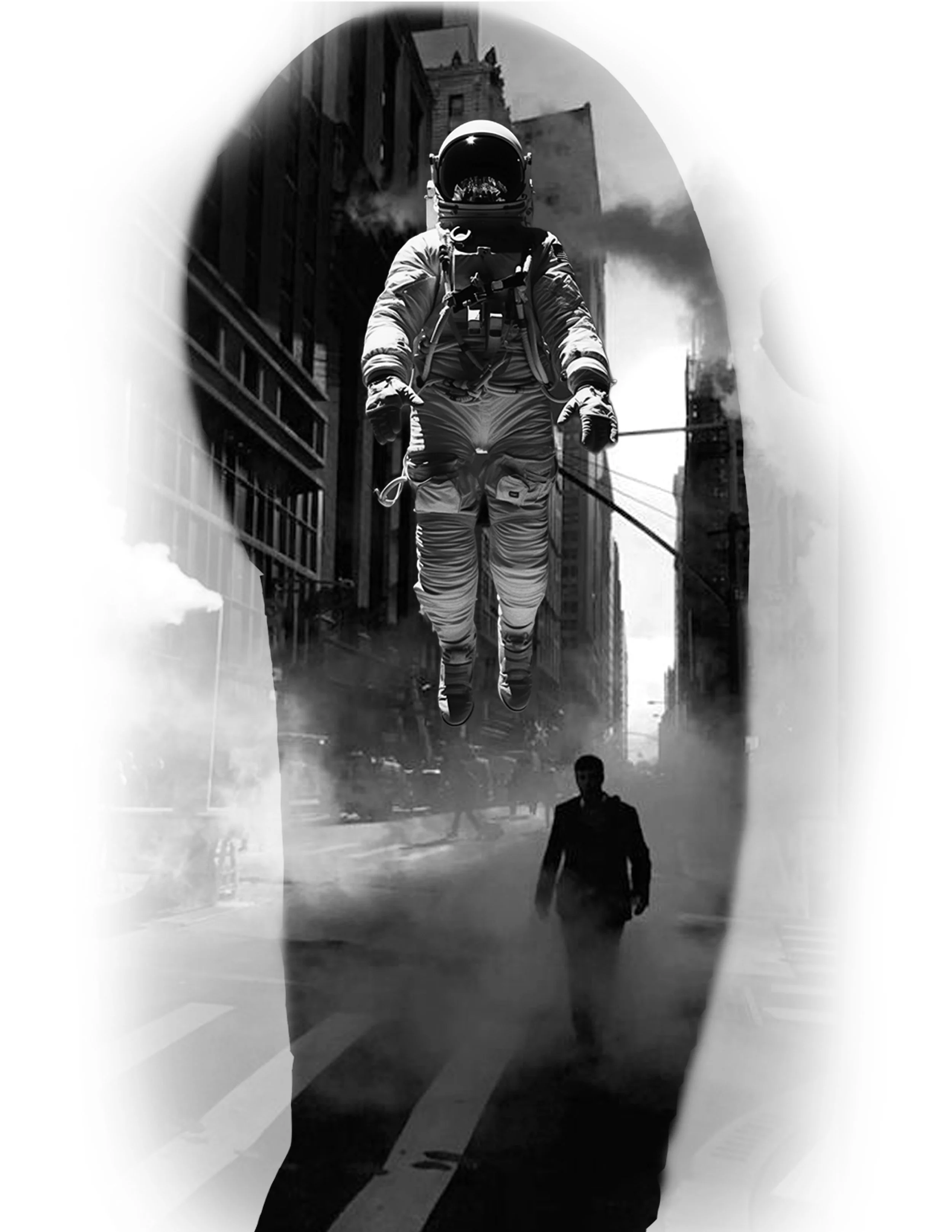 In the first concept, an astronaut hovers above a fog filled street while a lone figure walks below. Steam curls between the buildings, creating depth and a heavy contrast. The smoke creates a natural negative space and softly transitions to beautifully fit the arm. The composition immediately establishes tension between grounded reality and the astronaut. The business man seems to walk with confidence and purpose while the astronaut floats above it all, enforcing the themes of ambition and isolation.