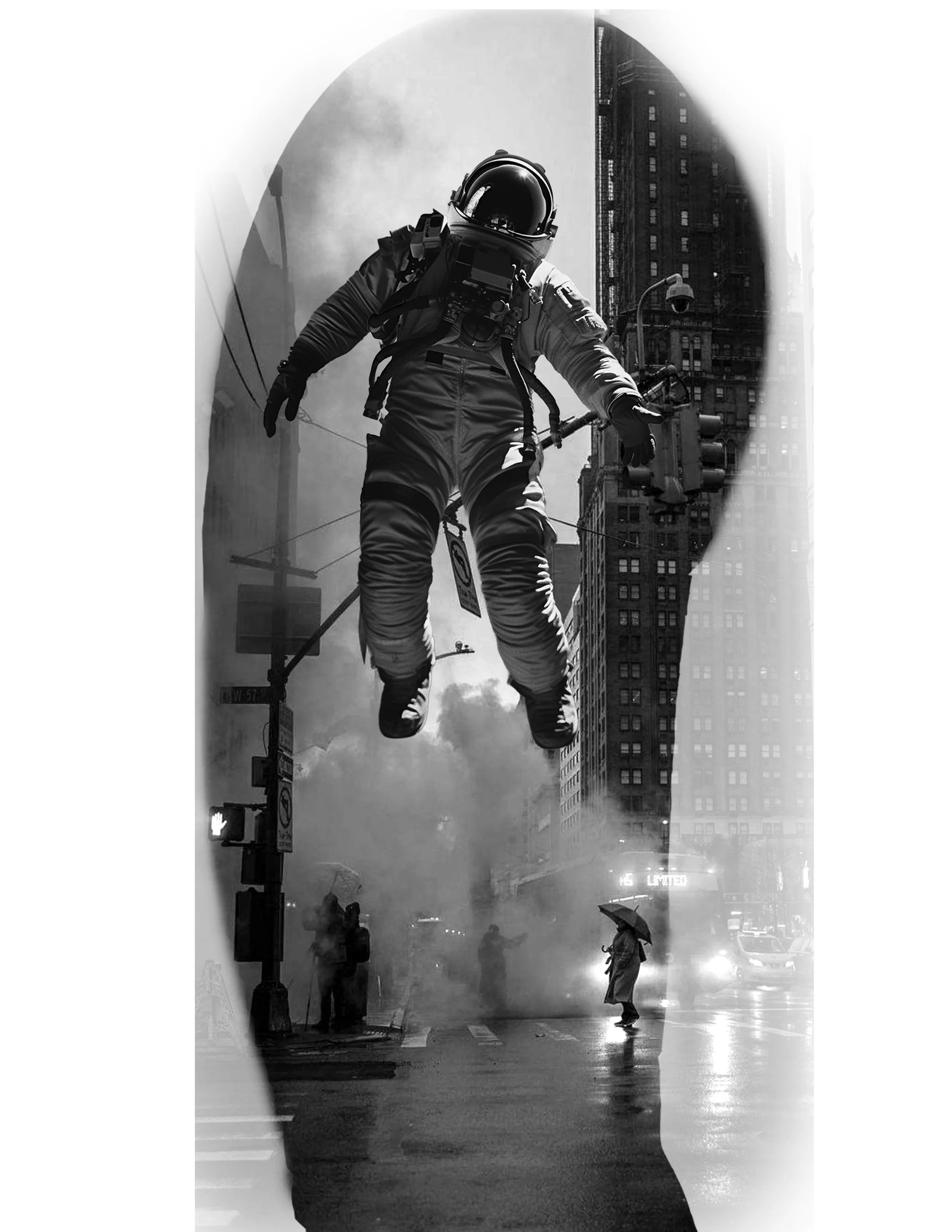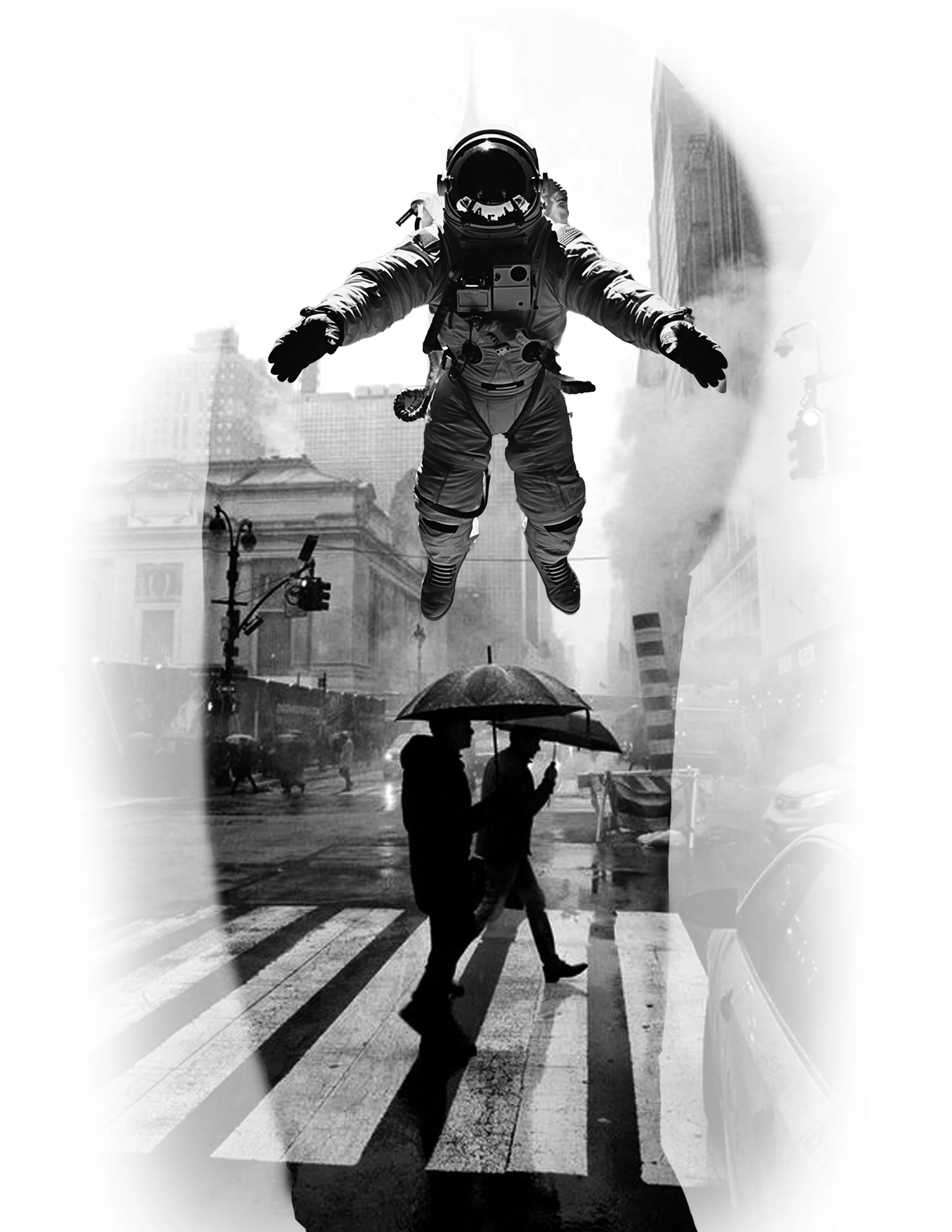 Back at street level, steam rises around pedestrians holding umbrellas. This time the astronaut floats lower, closer to the world but still not a part of it. The smoke and rain create smooth gradients that would allow seamless transitions between upper and lower arm sections.
