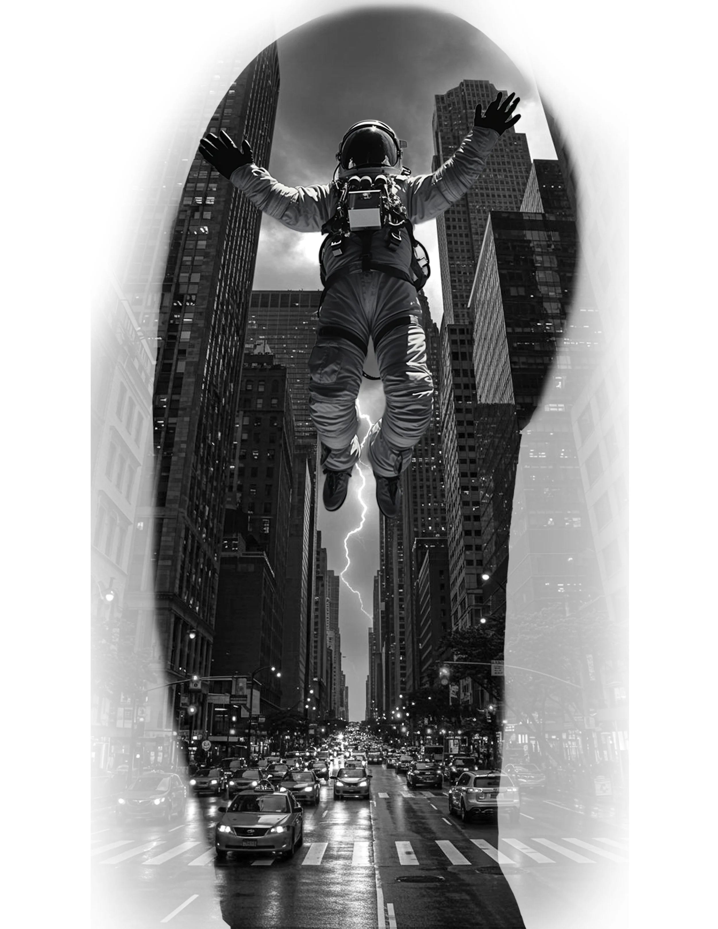 Lightning splits the skyline while traffic lines the streets below. With his arms raised, the astronaut appears almost triumphant. This piece is one of the most dynamic in the series, with the lighting bolt acting as visual symmetry which is ideal for a sleeve layout like this. It adds movement and intensity while reinforcing themes of chaos versus composure. The astronaut is calm in the storm, untouched by the noise below.